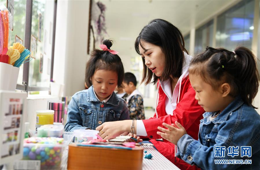 在貴州省正安縣瑞濠街道易地扶貧搬遷安置點的一所幼兒園,老師指導小朋友做手工(10月11日攝)。新華社記者 楊文斌 攝
