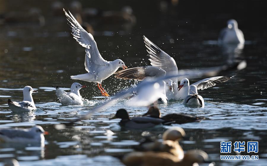 兩只紅嘴鷗在龍王潭公園的水面上爭食(12月20日攝)。新華社記者張汝鋒攝