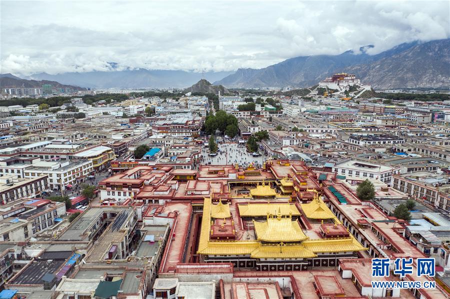 8月10日無人機拍攝的大昭寺和布達拉宮。新華社記者王建華攝