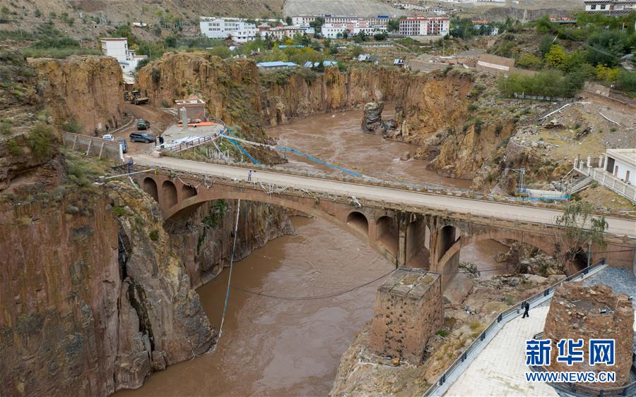 在西藏八宿的怒江大橋旁矗立著一座橋墩(10月23日攝)。據(jù)十八軍后人介紹,工兵5團(tuán)一位戰(zhàn)士修橋時過于疲憊,不慎掉入了正在澆注的橋墩中,成了永遠(yuǎn)的紀(jì)念碑。新華社記者江宏景攝