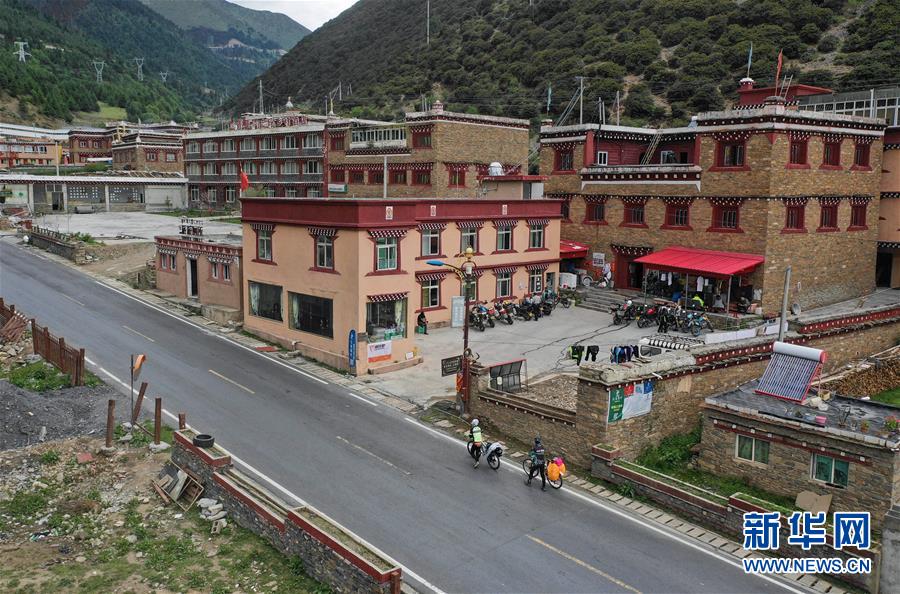 在川藏公路沿線的雅江縣剪子彎山下相格宗村,騎行在川藏線上的游客來到布珠民居客棧里住宿用餐(6月26日攝)。新華社記者江宏景攝