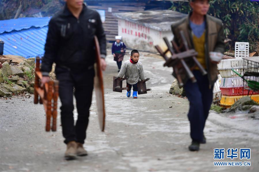 烏英苗寨一名小朋友跟隨大人,帶小板凳前來參加百家宴,慶祝新蘆笙柱豎立(12月22日攝)。新華社記者黃孝邦攝