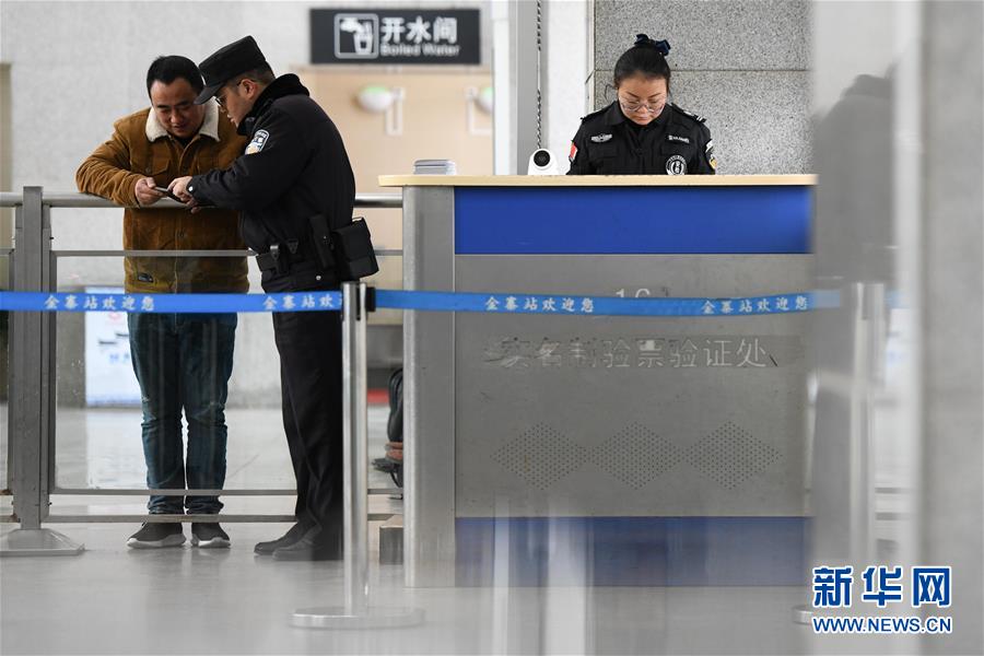 金寨火車站派出所民警呂錦鵬(前右)在檢票口執(zhí)勤(12月19日攝)。新華社記者鄧堅攝