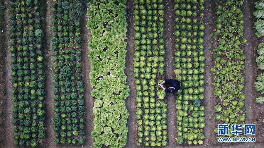 金寨火車站派出所民警呂錦鵬在菜園摘菜(12月19日無人機拍攝)。由于金寨火車站派出所離縣城較遠,平時買菜不方便,民警們在院子里開墾了一處小菜園。新華社記者張端攝