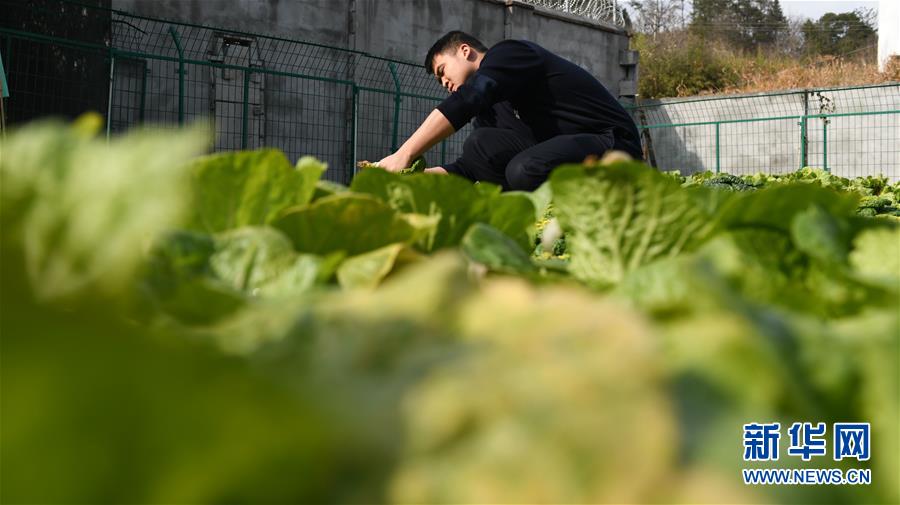 金寨火車站派出所民警呂錦鵬在菜園摘菜(12月19日攝)。由于金寨火車站派出所離縣城較遠,平時買菜不方便,民警們在院子里開墾了一處小菜園。新華社記者張端攝