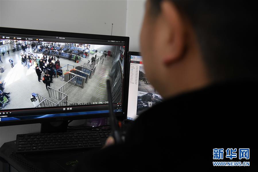 金寨火車站派出所民警何津超通過監(jiān)控視頻了解候車大廳內(nèi)的實時情況(12月19日攝)。新華社記者張端攝