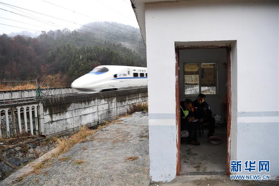 金寨火車站派出所民警張嗣一在站臺接車(12月19日攝)。安徽合肥鐵路公安處金寨火車站派出所位于大別山腹地。在這里,除了所領(lǐng)導(dǎo)外,青年民警平均年齡不到29歲。他們遠離家鄉(xiāng),扎根大山深處的小站派出所,戰(zhàn)斗在守護客運平安的第一線。新華社記者張端攝