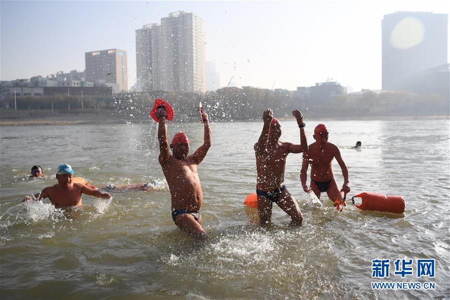 12月20日,冬泳愛好者在黃河冬泳。新華社記者賀長(zhǎng)山攝