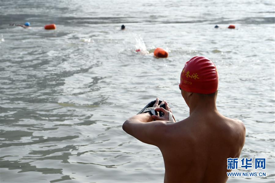 12月20日,一名冬泳愛(ài)好者在進(jìn)入黃河冬泳前給自己計(jì)時(shí)。新華社記者馬寧攝