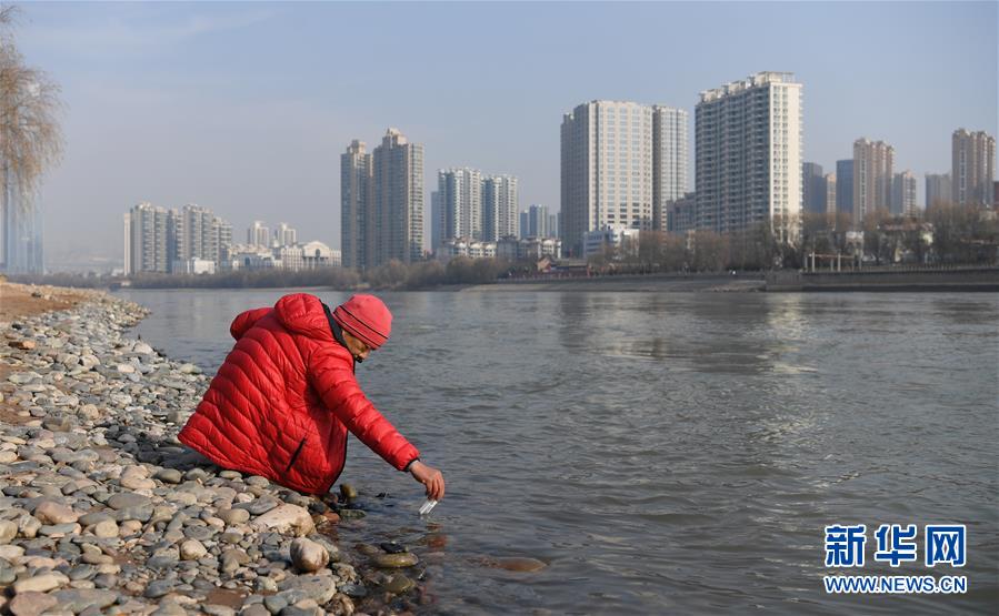 12月20日,冬泳愛好者孟猛在冬泳前測量水溫,當日水溫僅為5攝氏度。新華社記者陶希夷攝