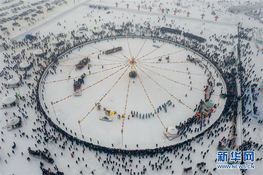 12月28日無人機拍攝的查干湖第十八屆冰雪漁獵文化旅游節(jié)開幕式現場。