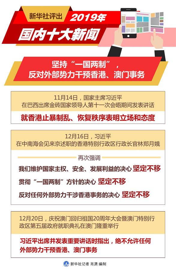 11月14日,國家主席習(xí)近平在巴西出席金磚國家領(lǐng)導(dǎo)人第十一次會晤期間發(fā)表講話,就香港止暴制亂、恢復(fù)秩序表明立場和態(tài)度。12月16日,習(xí)近平在中南海會見來京述職的香港特別行政區(qū)行政長官林鄭月娥,再次強(qiáng)調(diào)我們維護(hù)國家主權(quán)、安全、發(fā)展利益的決心堅定不移,貫徹“一國兩制”方針的決心堅定不移,反對任何外部勢力干涉香港事務(wù)的決心堅定不移。12月20日,慶祝澳門回歸祖國20周年大會暨澳門特別行政區(qū)第五屆政府就職典禮在澳門隆重舉行,習(xí)近平出席并發(fā)表重要講話時指出,絕不允許任何外部勢力干預(yù)香港、澳門事務(wù)。