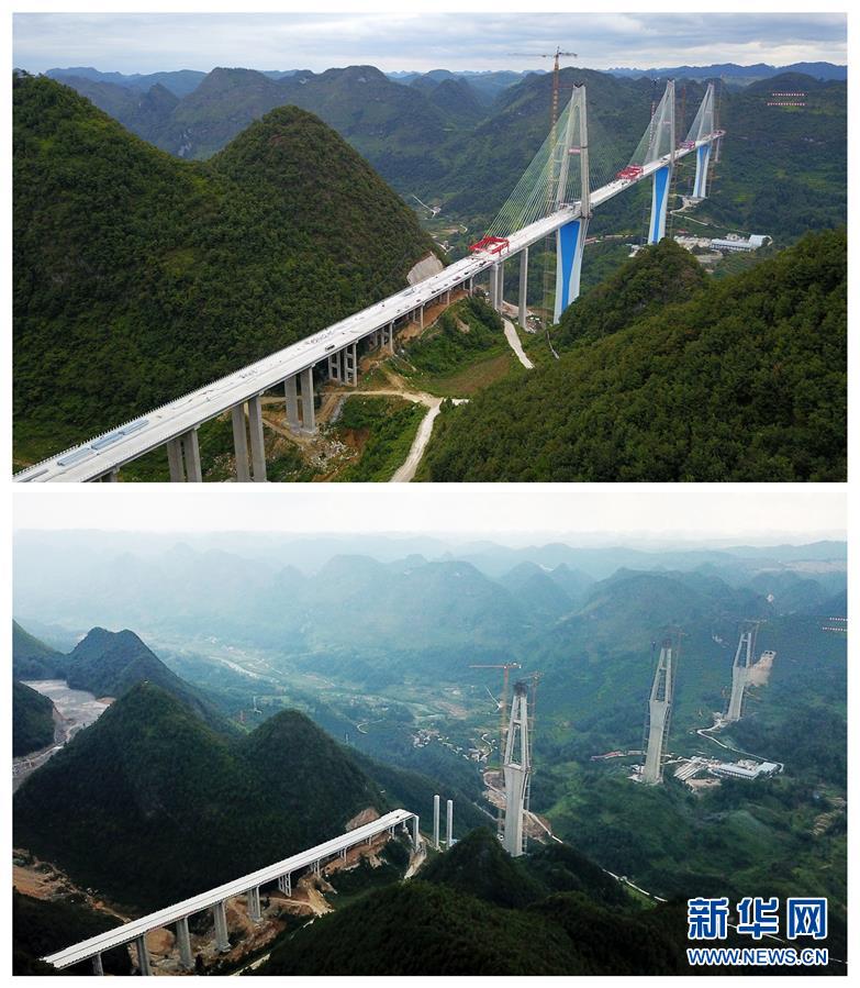 拼版照片:上圖為2019年9月20日無人機(jī)拍攝的平塘特大橋;下圖為2018年9月25日拍攝的平塘特大橋。新華社記者楊文斌攝