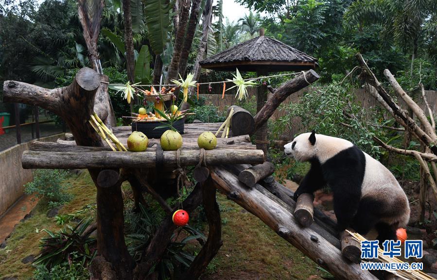 當(dāng)日是2019年最后一天,海南熱帶野生動植物園的工作人員為園區(qū)內(nèi)大熊貓“貢貢”“舜舜”準備了用葡萄、南瓜、竹筍等果蔬制作的“火鍋串串香”,讓它們用“擼串”的方式迎接新年的到來。 新華社記者 楊冠宇 攝
