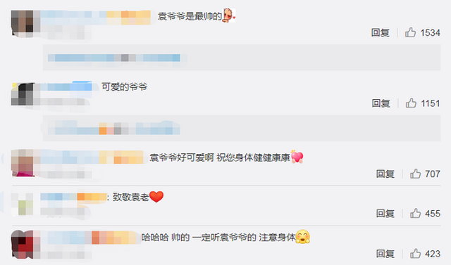 網(wǎng)友看后,紛紛評(píng)論,“袁爺爺是帥的”,“一定聽(tīng)袁爺爺話注意身體”!