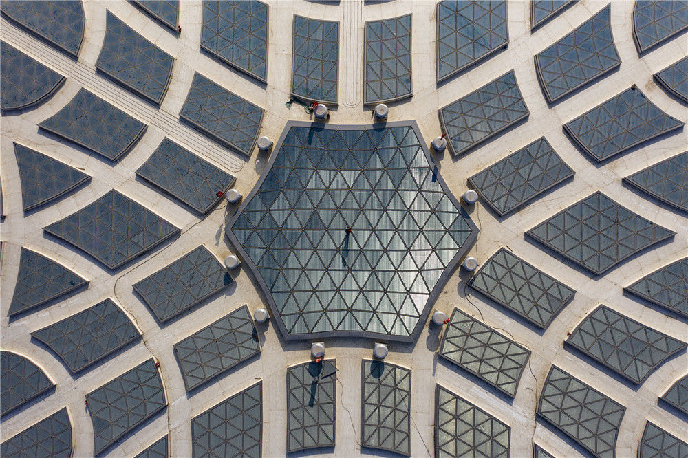 2019年1月13日,北京大興機(jī)場(chǎng)航站樓頂部最中央,一個(gè)工人正在進(jìn)行驗(yàn)收工作。陳國亨/視覺中國