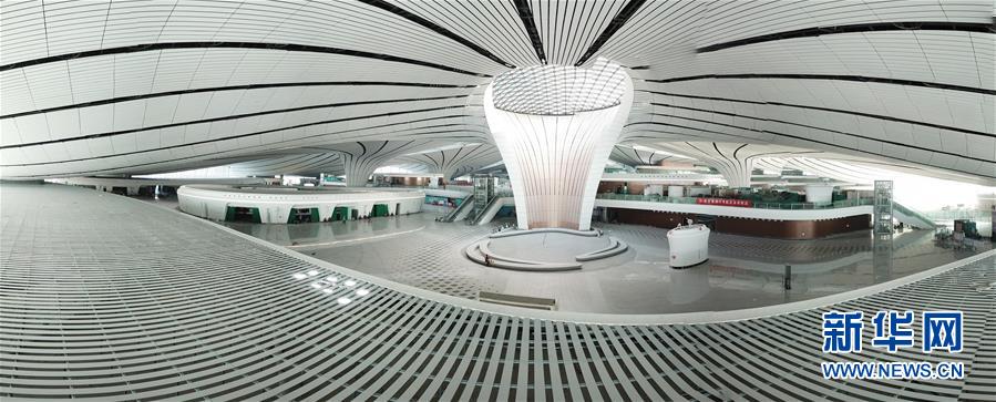 這是6月14日無(wú)人機(jī)拍攝的北京大興國(guó)際機(jī)場(chǎng)航站樓內(nèi)景(全景拼接照片)。新華社記者才揚(yáng)攝