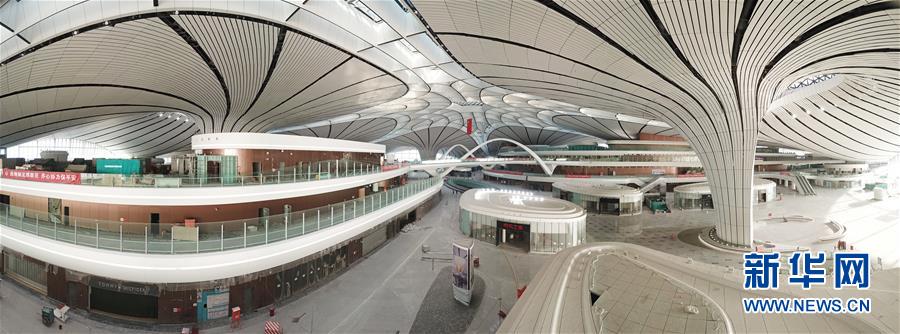 這是6月14日無人機(jī)拍攝的北京大興國際機(jī)場(chǎng)航站樓內(nèi)景(全景拼接照片)。新華社記者才揚(yáng)攝