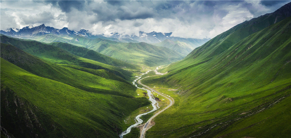 2019年7月10日,新疆獨(dú)庫公路蜿蜒在天山山脈的草原山谷中。黃光浩/視覺中國(guó)