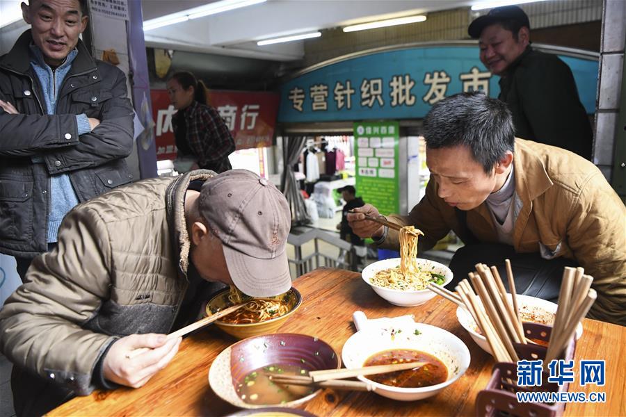 冉光輝(前右)在重慶朝天門大正商場附近吃小面,這是他的午餐(1月5日攝)。新華社記者王全超攝