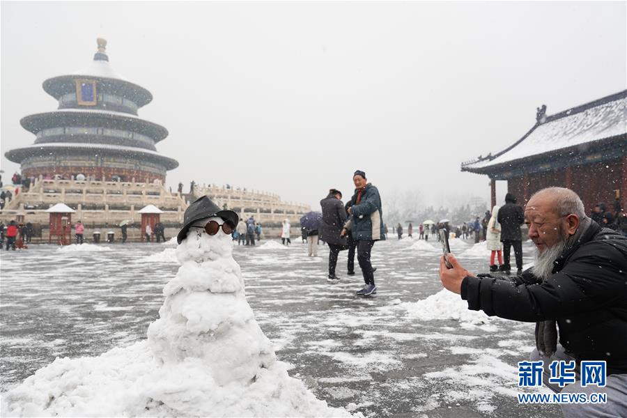 12月16日,在北京天壇公園,一名游客拍攝雪人。當日,北京迎來降雪天氣。新華社記者鞠煥宗攝