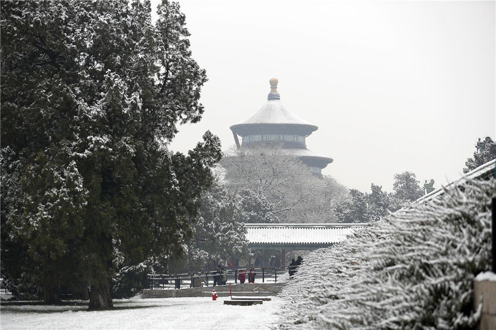 2019年11月30日,民眾在北京天壇公園內(nèi)賞雪。29日,北京迎來2019年冬季初雪。富田(攝影部)/中新社/視覺中國