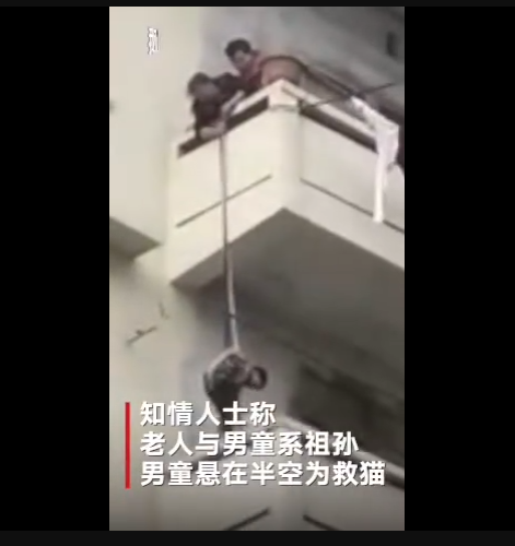 1月5日下午,四川南充市蓬安縣,一奶奶在百順街老百貨公司宿舍樓上,用一根繩子綁著孫子的腰,將其從五樓吊至三樓一窗戶遮雨臺上,只為救一只貓。此舉嚇得周圍鄰居紛紛呼喊:危險!網(wǎng)友:小孩子不懂事,老人是糊涂了嗎?到底誰是親的?