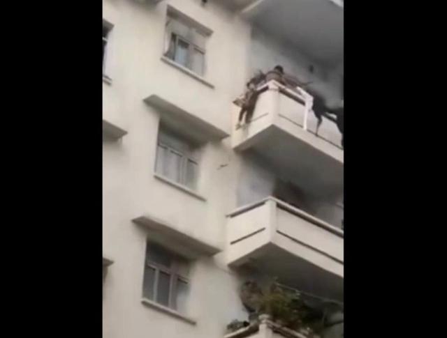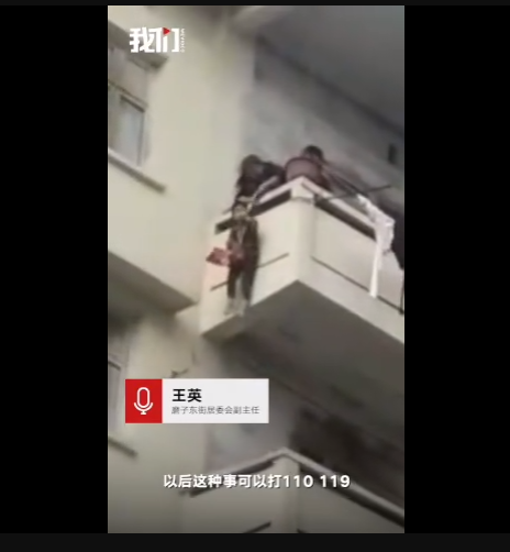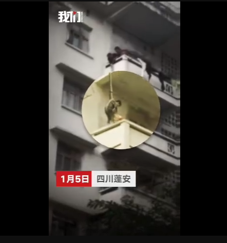 一只貓跑到了百順街老百貨公司宿舍樓三樓的窗戶遮雨臺上,被5樓的老太太發(fā)現(xiàn),老太太善心發(fā)作,竟將孫子用繩子吊起,從5樓慢慢放至3樓救貓,整個過程不禁令人捏汗。