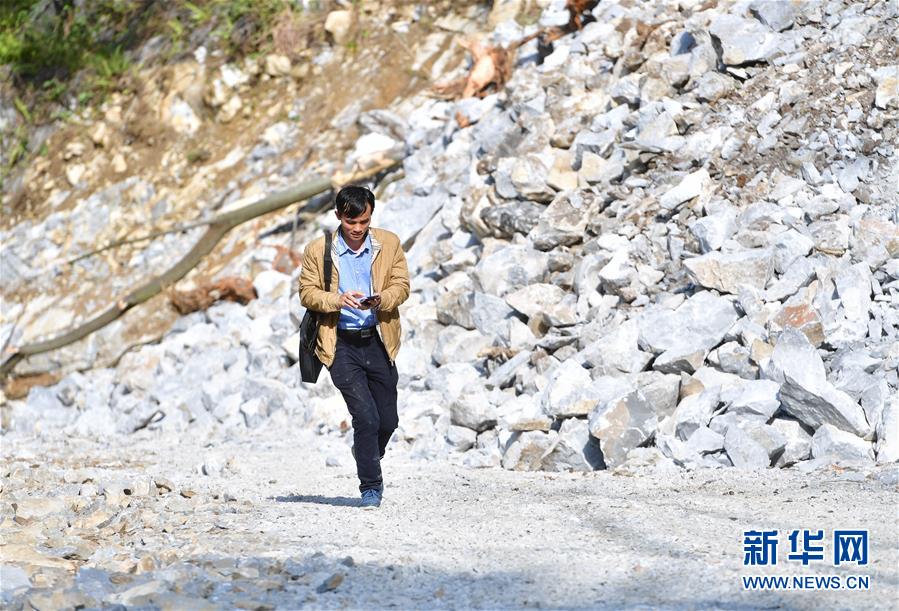 八好村駐村第一書記韋德王徒步前往弄麻屯開展扶貧工作,弄麻屯的公路尚在建設當中(2019年12月16日攝)。新華社記者黃孝邦攝