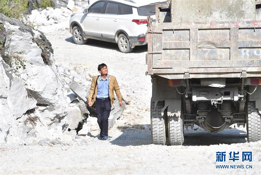 八好村弄豪屯的砂石路剛剛修通,碎石多、路況差,駐村第一書記韋德王駕車下屯途中,經常要下車將大石塊搬走(2019年12月16日攝)。新華社記者黃孝邦攝