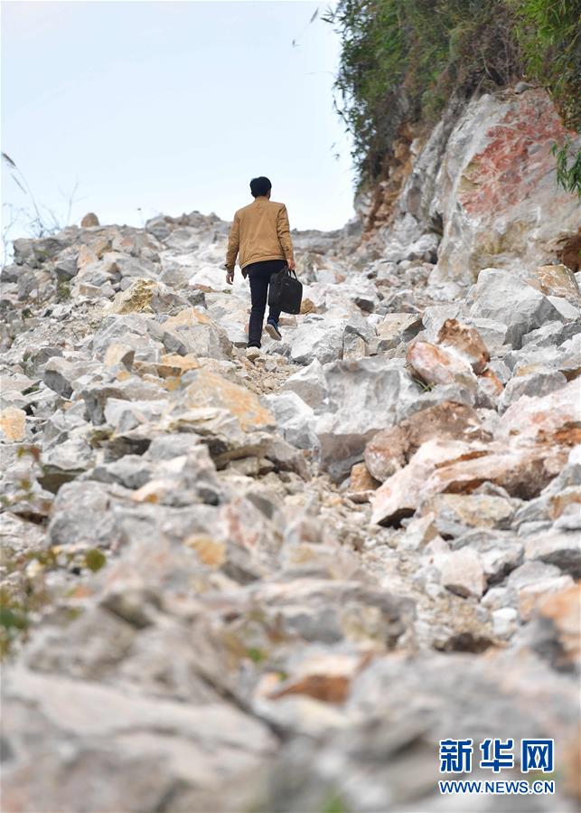 八好村駐村第一書記韋德徒步前往弄麻屯開(kāi)展扶貧工作,弄麻屯的公路尚在建設(shè)當(dāng)中(2019年12月16日攝)。新華社記者黃孝邦攝