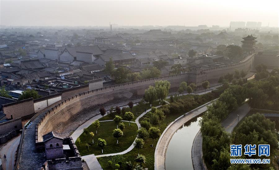 這是7月20日無人機(jī)拍攝的晨曦中的平遙古城。