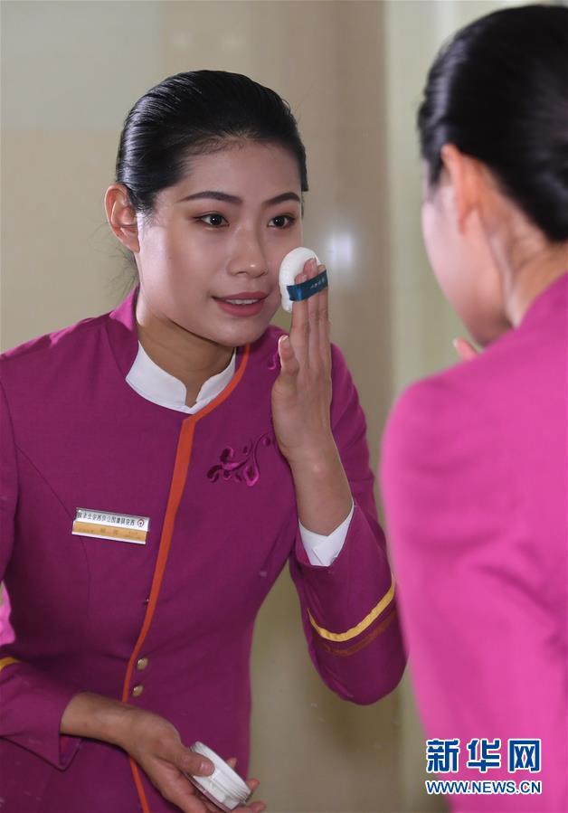 吉如在鏡子前化妝,帶著滿滿的笑意開啟一天的工作(1月15日攝)。 新華社記者 陶明 攝