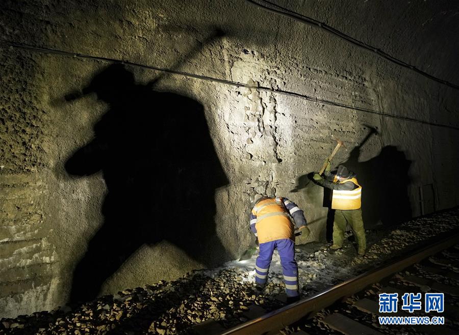 1月6日,在加格達奇工務段西羅奇嶺二號隧道,西羅奇維修工隊工作人員進行維修作業(yè)。新華社記者才揚攝