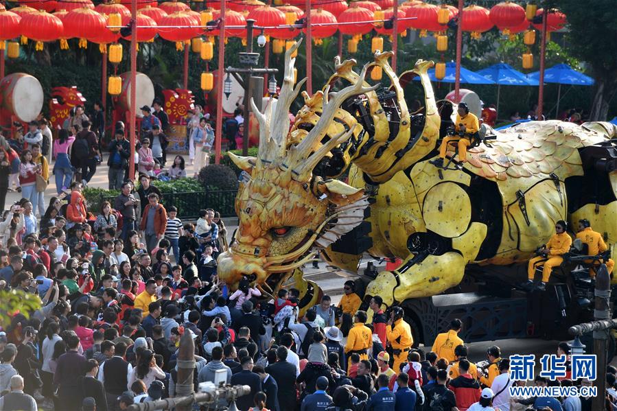 1月18日,大型機械裝置藝術(shù)品“龍馬精神”在珠海長隆海洋王國巡游展示。新華社記者 劉大偉 攝