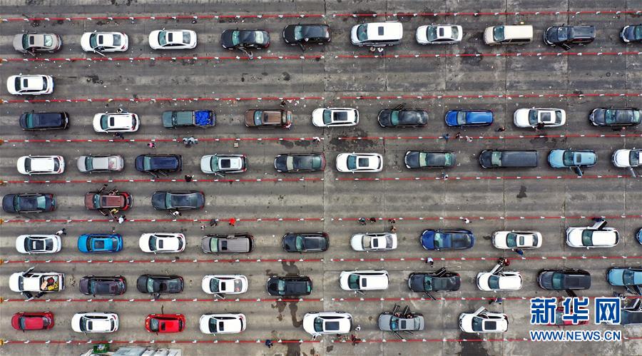 1月19日,車(chē)輛在??谛阌⒏圯喍纱a頭等待登船(無(wú)人機(jī)照片)。 新華社記者 郭程 攝