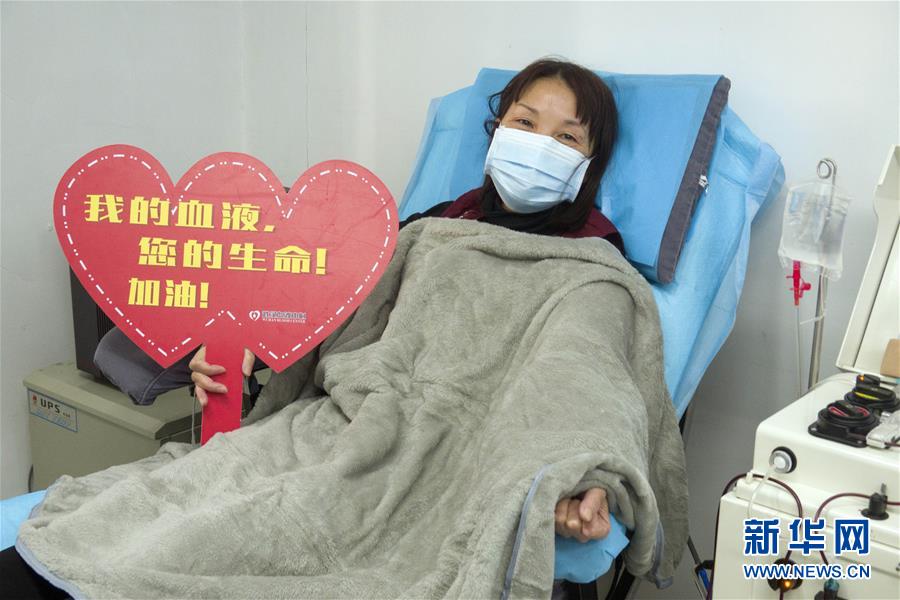 在武漢血液中心的中國醫(yī)學科學院CPnCoV項目組,康復病人、來自漢口醫(yī)院的護士蔡桃英在獻血漿時拍照留念。她說同事們都在一線忙碌,她獻血漿后,再休息幾天就準備回到崗位上班,她說自己感染是由于早期防護不足經(jīng)驗不夠造成的,再次回到工作崗位一定沒有問題(2月17日攝)。 新華社記者 才揚 攝