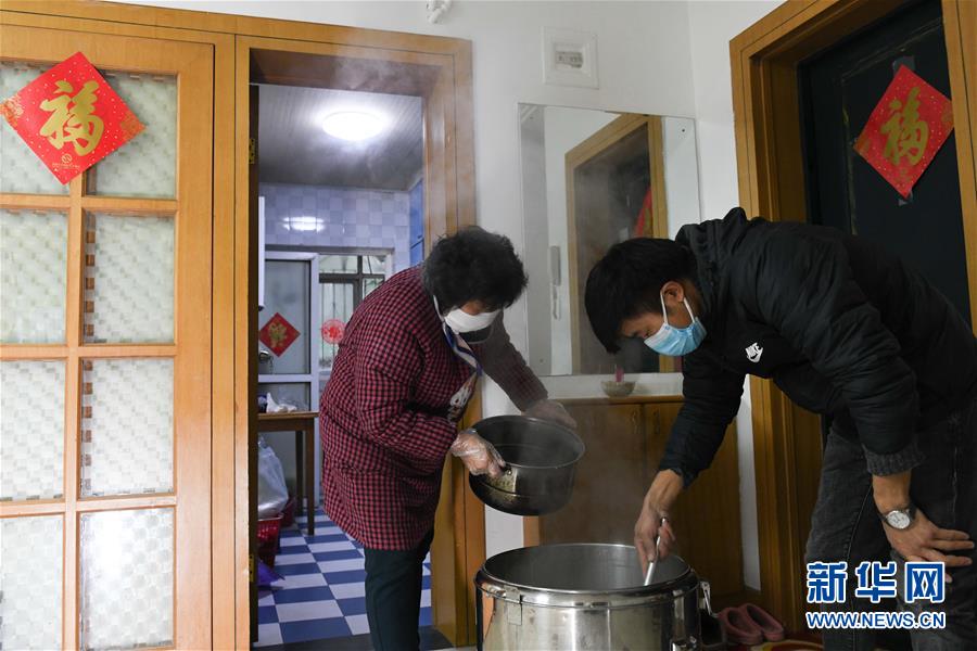 2月28日,張?zhí)m英將做好的粥倒入保溫桶,準(zhǔn)備由兒子徐曉軍(右)送給疫情防控人員。新華社記者張端攝