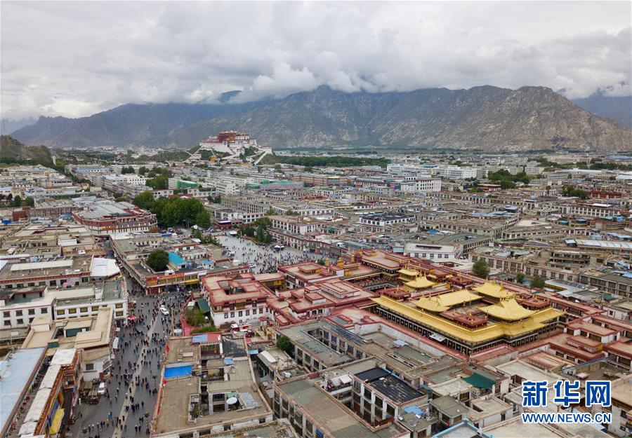 8月10日無(wú)人機(jī)拍攝的大昭寺和布達(dá)拉宮。新華社記者王建華攝