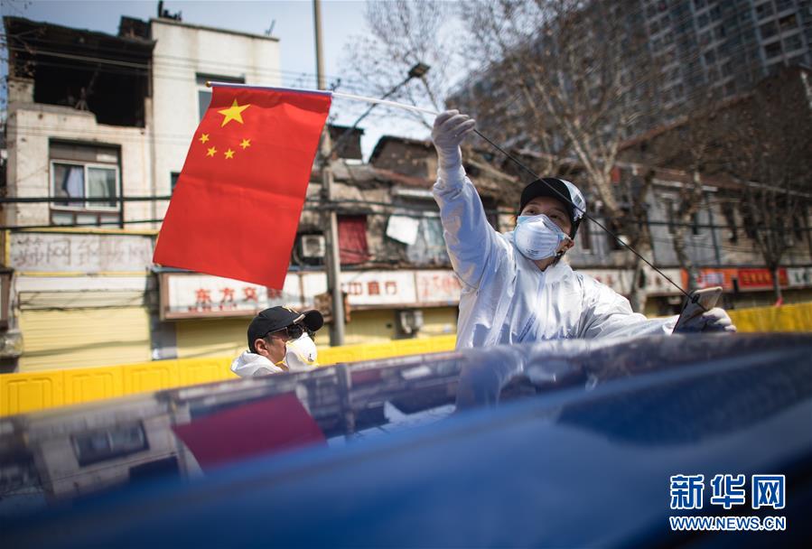 2月29日,W大武漢緊急救援隊隊長王紫懿(右)將國旗插在車上。 新華社記者 肖藝九 攝