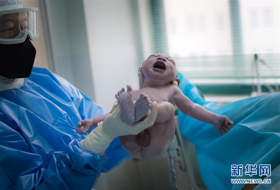 3月1日下午,在武漢市婦幼保健院分娩室,助產士吳丹將新出生的寶寶抱給產婦劉婷看。新華社記者 肖藝九 攝