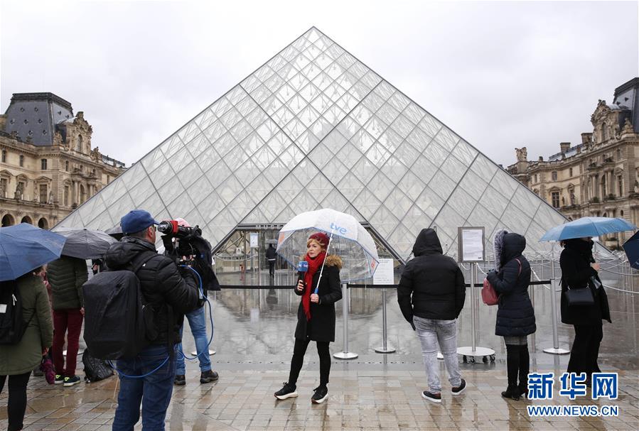 3月2日,在法國巴黎,記者在盧浮宮博物館外工作。