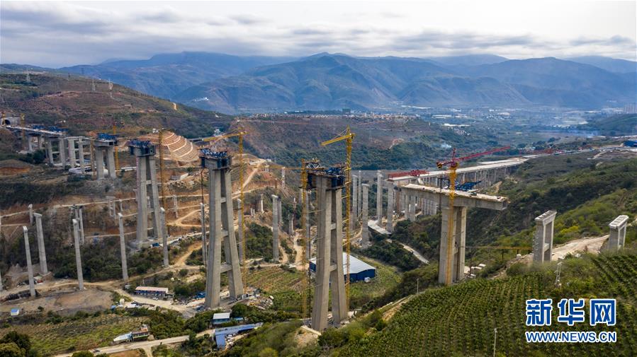 這是3月5日拍攝的中老鐵路南溪河特大橋橫跨在建高速公路(無人機(jī)照片)。近期,中老鐵路玉溪至磨憨段有序復(fù)工復(fù)產(chǎn),由中鐵四局承建的中老鐵路全線重點(diǎn)控制性工程——元江特大橋、南溪河特大橋正在加緊施工建設(shè)。新華社記者 江文耀 攝
