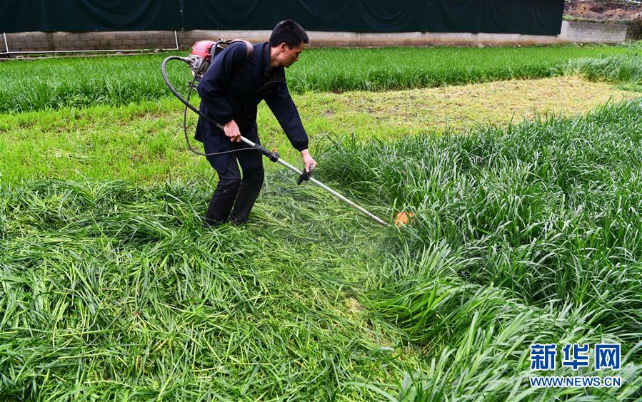 在貴州省銅仁市德江縣平原鎮(zhèn)坳田村,養(yǎng)殖戶(hù)在坳田畜牧養(yǎng)殖農(nóng)民專(zhuān)業(yè)合作社收割牧草(2月29日攝)。新華社記者 楊文斌 攝