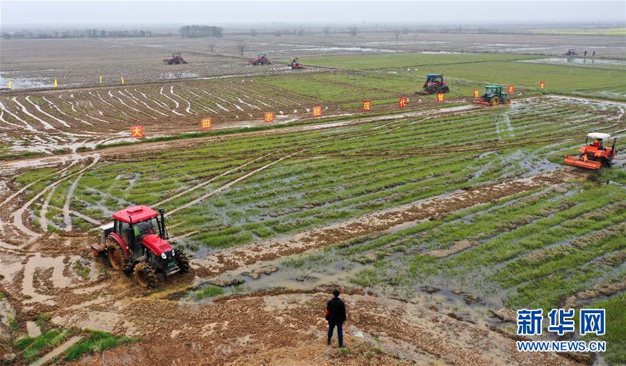 江西省南昌市南昌縣蔣巷鎮(zhèn)農(nóng)民駕駛拖拉機進行春耕翻地作業(yè)(無人機照片,2月28日攝)。新華社記者 彭昭之 攝