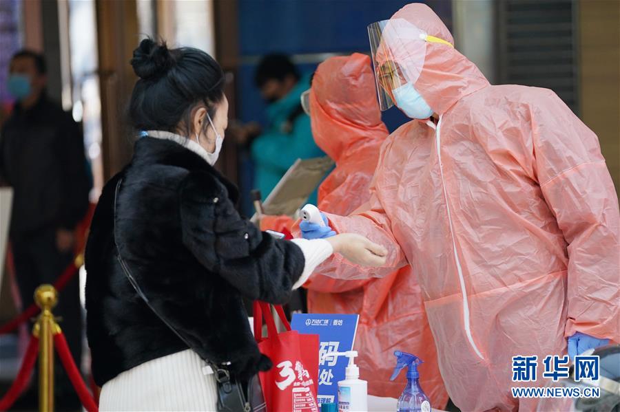 3月13日,在哈爾濱香坊萬達廣場內,工作人員在給進店顧客測體溫。 近日,哈爾濱市多家大型商場陸續(xù)恢復營業(yè)。這些恢復營業(yè)的商場采取多種措施,從嚴細致做好疫情防控和安全風險防范工作,為廣大顧客提供安全放心的購物空間。 新華社記者 王建威 攝