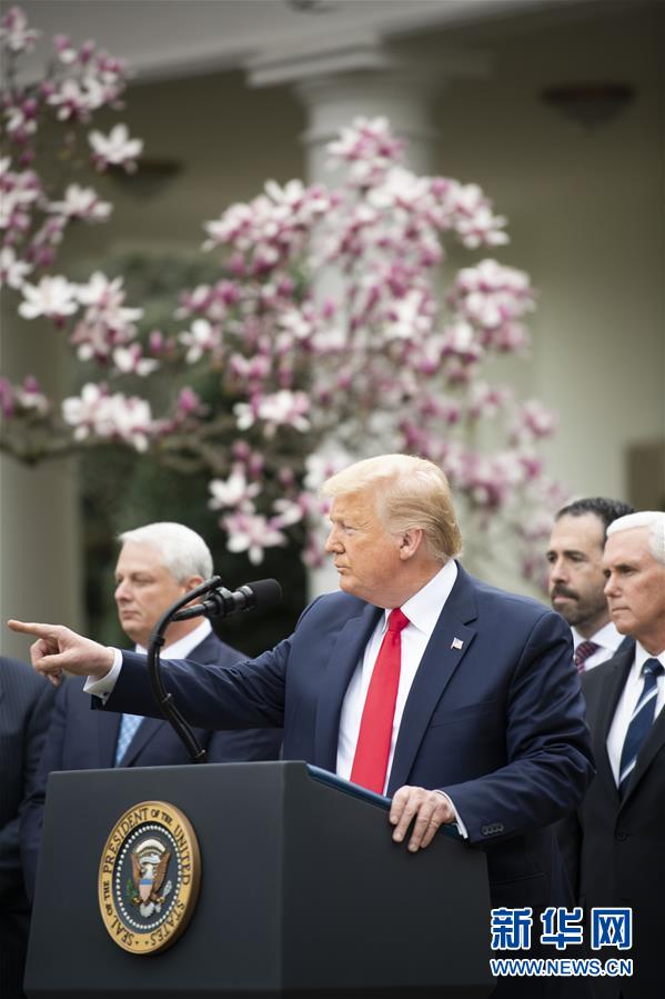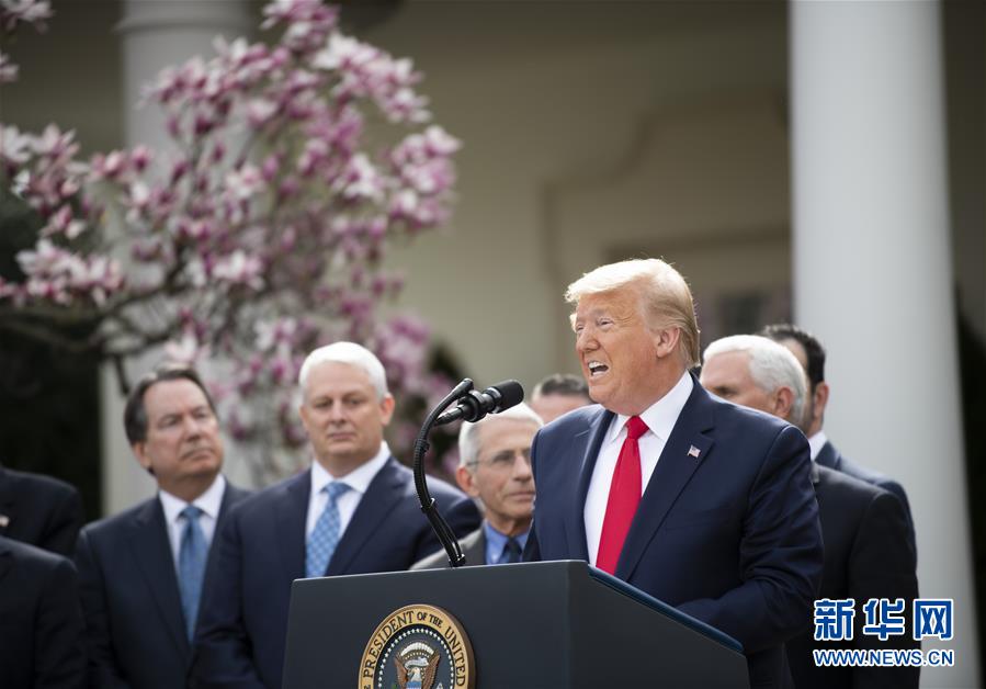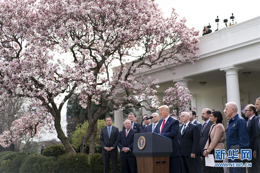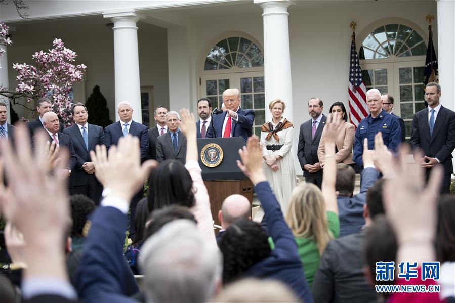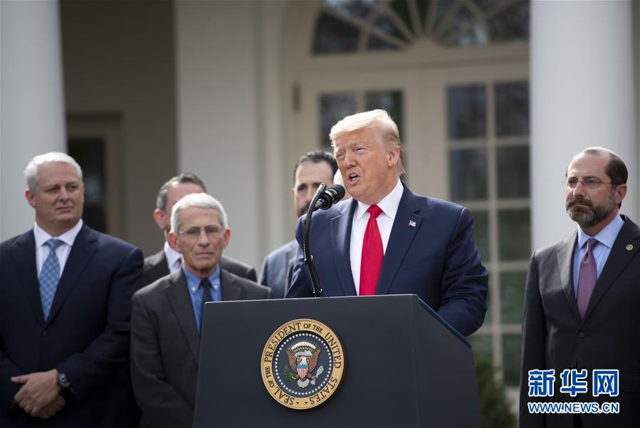 3月13日,美國(guó)總統(tǒng)特朗普(中)在華盛頓白宮的記者會(huì)上講話。特朗普當(dāng)天下午在白宮發(fā)表講話時(shí)正式宣布“國(guó)家緊急狀態(tài)”。他說,此舉旨在讓美國(guó)聯(lián)邦政府全力投入到抗擊新冠肺炎疫情的努力中。這項(xiàng)舉措將釋放500億美元資金,幫助各州和地方政府應(yīng)對(duì)疫情。新華社記者劉杰攝