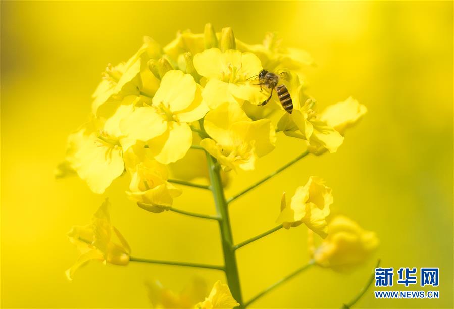 3月14日,在武漢市西北部市郊,蜜蜂在油菜花上采蜜。隨著氣溫升高,春意在武漢的枝頭上萌動(dòng),花朵漸次開放。新華社記者肖藝九攝
