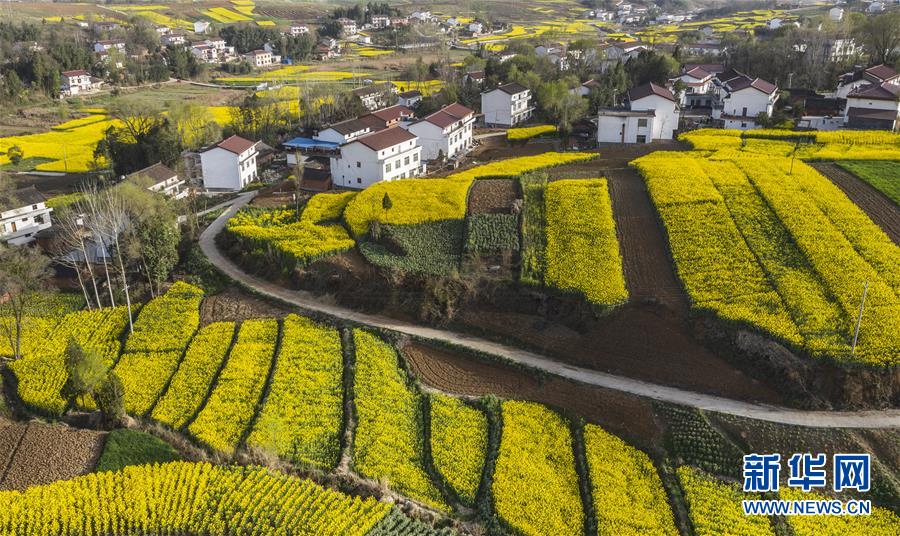 3月14日,洋縣龍亭鎮(zhèn)柳山村盛開(kāi)的油菜花與村舍構(gòu)成美麗的圖畫(huà)(無(wú)人機(jī)照片)。 新華社記者陶明攝