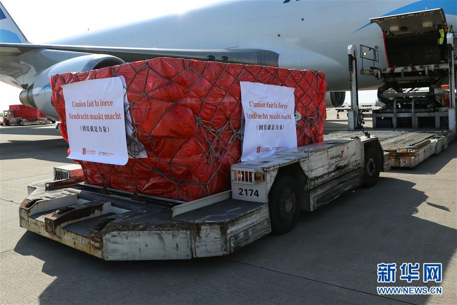 來自中國的30萬只口罩當(dāng)?shù)貢r間16日中午運抵比利時列日機(jī)場。 新華社記者 張鋮 攝
